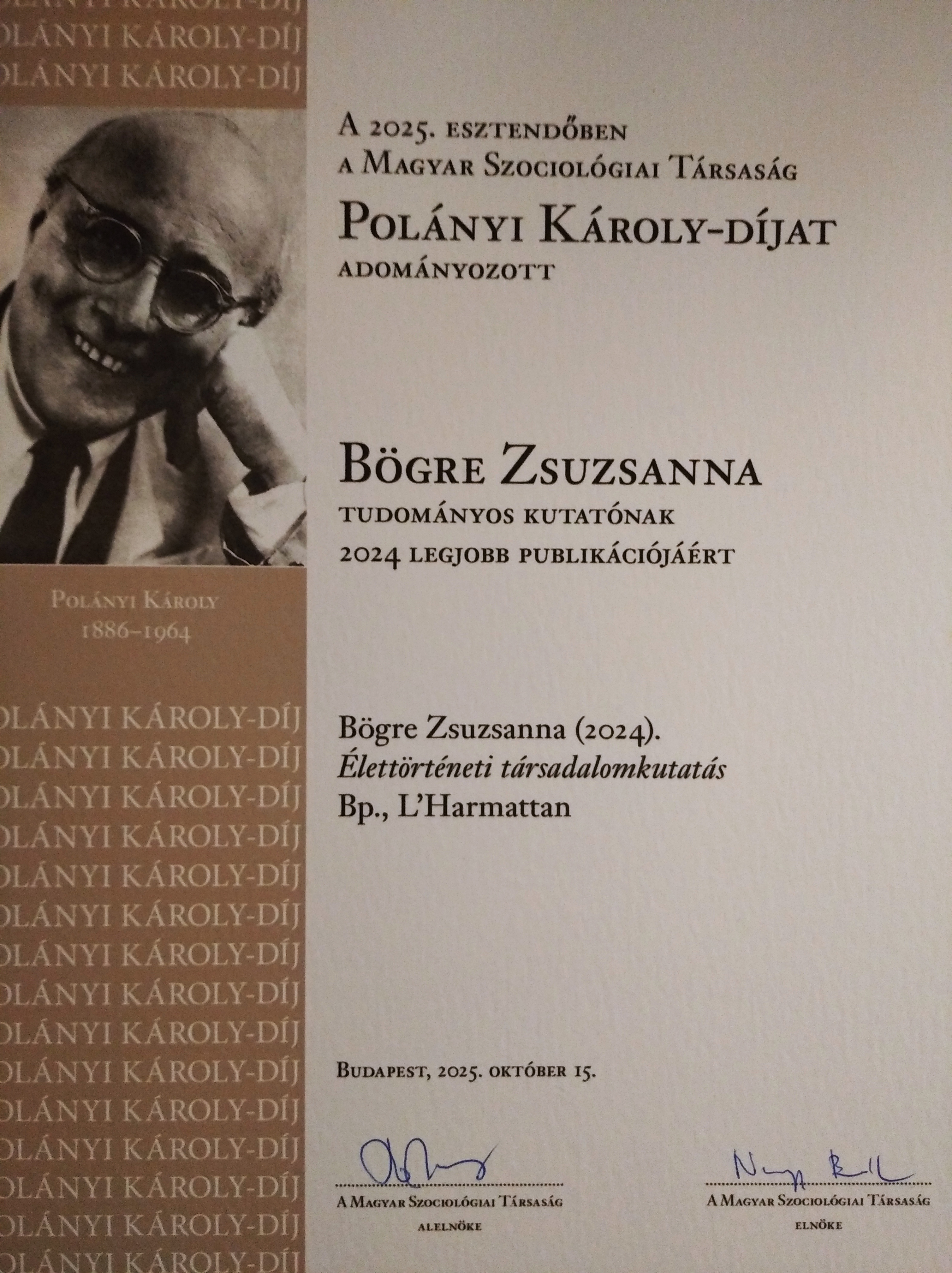 A Magyar Szociológiai Társaság Polányi Károly-díjat adományozott intézetünk oktatójának, Bögre Zsuzsannának 2024 legjobb publikációjáért.