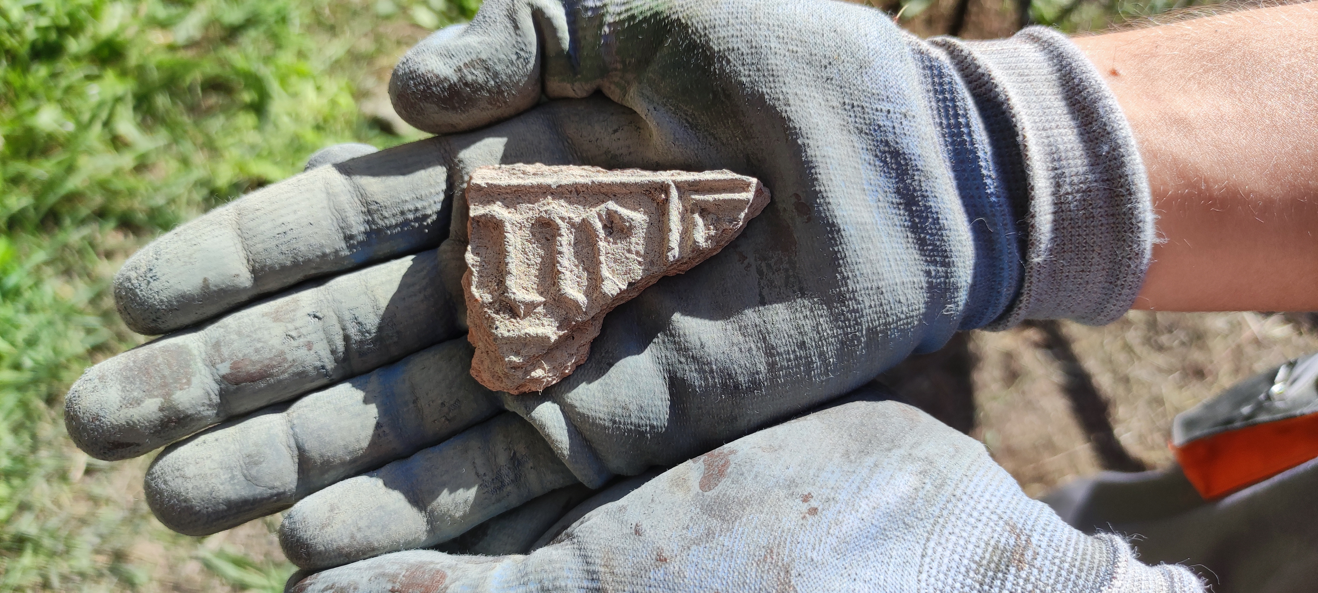 Mázatlan kályhacsempe töredék gótikus felirattal