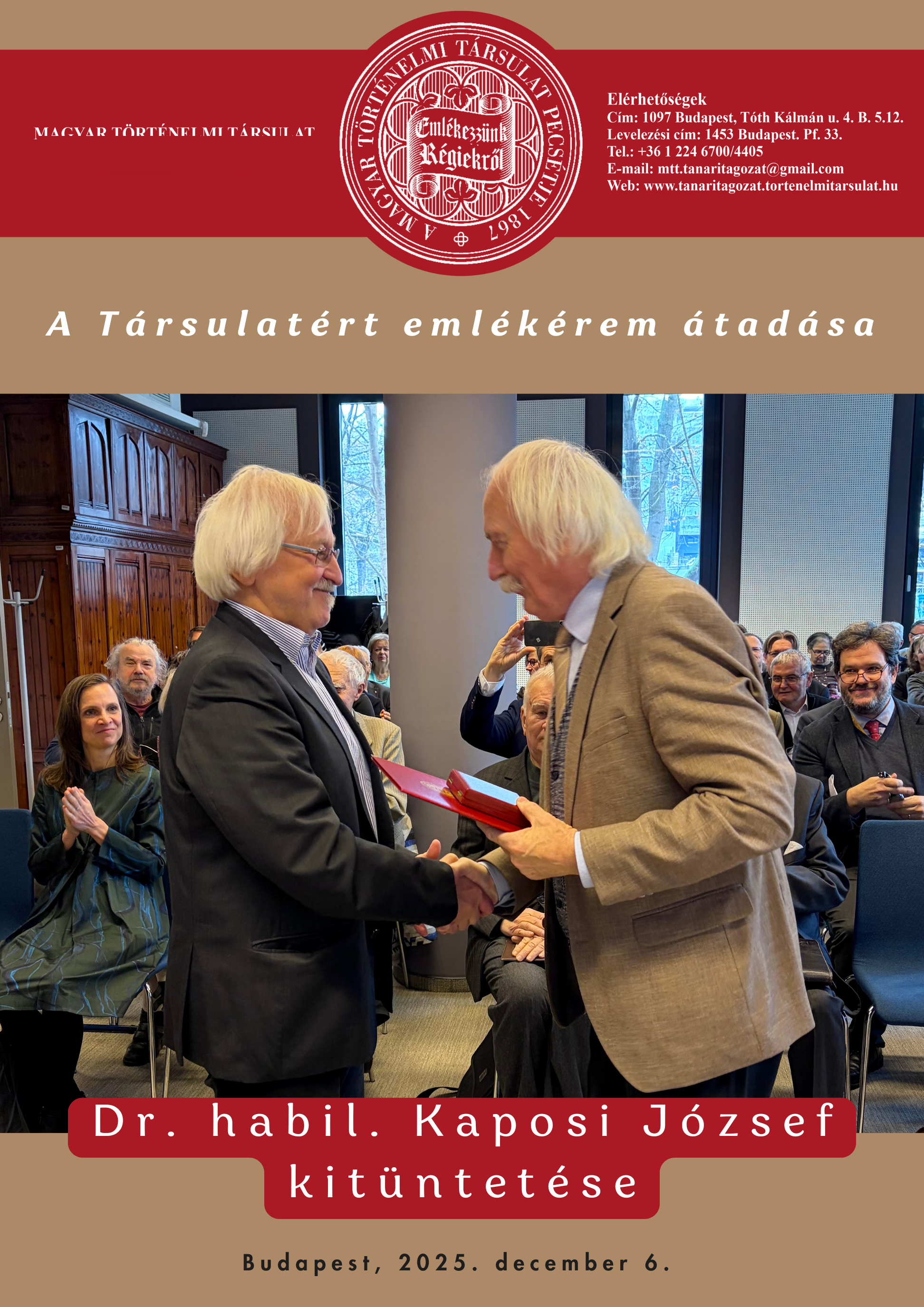 A Magyar Történelmi Társulat elnöksége nevében Dr. habil. Ablonczy Balázs főtitkár és Prof. Dr. Fodor Pál elnök adta át Kaposi Józsefnek a Társulatért emlékérmet, sokoldalú tudományos, tudományszervezői és pedagógiai munkássága előtt tisztelegve.