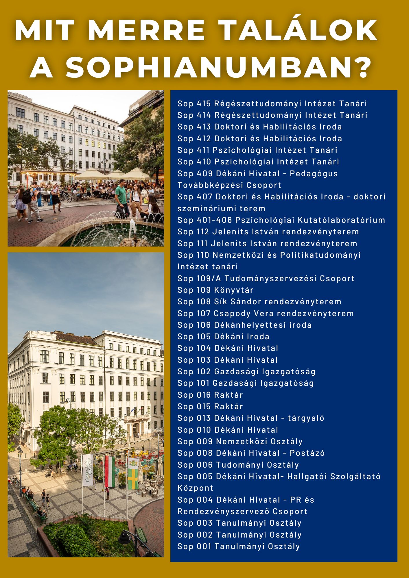 Sophianum: 1088 Budapest, Mikszáth tér 1. | Danubianum: 1111 Budapest, Bertalan Lajos u. 2. | Iohanneum: 2500 Esztergom, Majer István út 1–3.