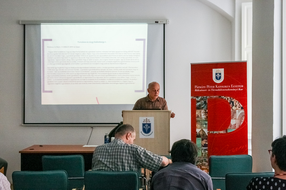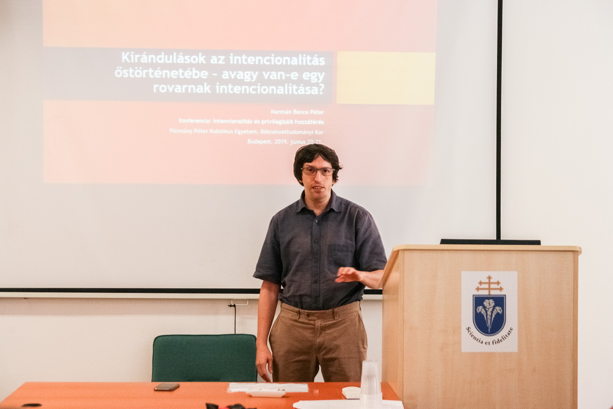 A Pázmány Péter Katolikus Egyetemen futó Intencionalitás: antik, kora modern, kortárs analitikus című (NKFIH 13839) projekt keretében 2019. június 20–21-én megtartott konferencia egy nagy múltú filozófiai fogalom, az intencionalitás történeti és szisztematikus szempontú körüljárására tett kísérletet.A Pázmány Péter Katolikus Egyetemen futó Intencionalitás: antik, kora modern, kortárs analitikus című (NKFIH 13839) projekt keretében 2019. június 20–21-én megtartott konferencia egy nagy múltú filozófiai fogalom, az intencionalitás történeti és szisztematikus szempontú körüljárására tett kísérletet. Intencionalitáson elmeállapotainknak azt a nehezen megmagyarázható, de lényegi tulajdonságát értjük, hogy természetüknél fogva tárgyakra irányulnak. Látni, hinni, gondolni, érezni, akarni valamit, félni valamitől, örülni valaminek szoktunk… Az intencionalitás magyarázata azért okoz nehézséget, mert egyetlen más természeti jelenség sem tűnik lénygénél fogva relációs jellegűnek: egyetlen természeti létező sem irányul esszenciálisan valami másra, vagy szól valami másról. Ezért jó okunk van azt gondolni, hogy az intencionalitás az anyag egyetlen ismert tulajdonságára sem vezethető minden további nélkül vissza.