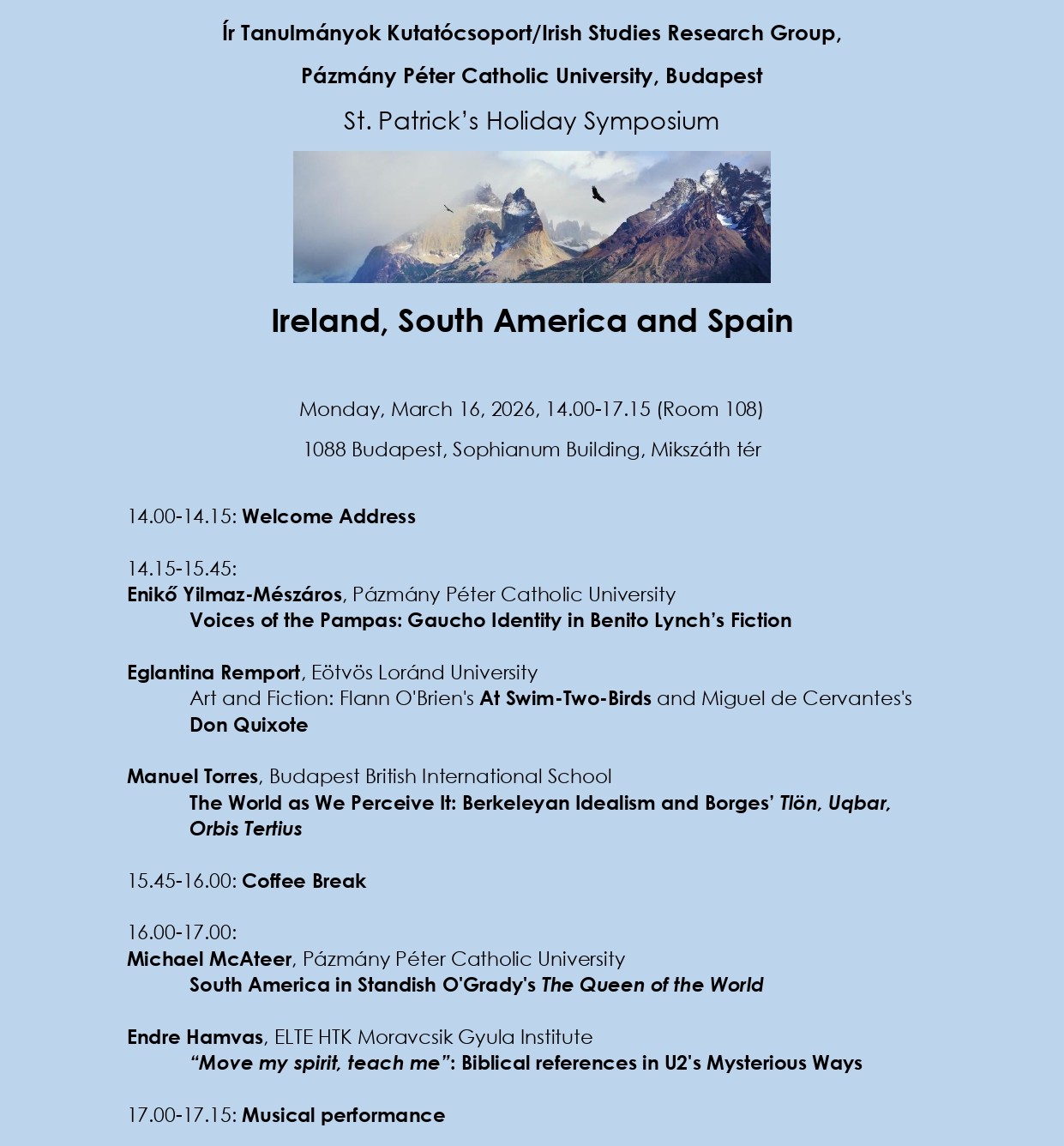 Report (in Hungarian) and photos: https://btk.ppke.hu/tudomanyos-hireink/szent-patrik-napi-tudomanyos-symposiumot-tartottak-a-pazmany-btk-n