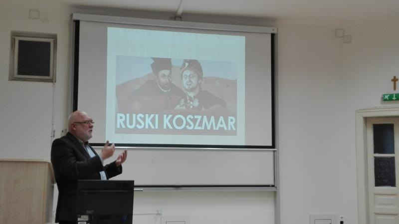 Az előadó külön kiemelte Báthory Oroszország elleni sikeres hadi vállalkozásait, melyeket az emlékezetpolitika összefüggéseiben is tárgyalt. A sikeres expanzió, amelynek következtében Oroszország egy rövid időre kiszorult a Baltikumból, más és más megítélés alá esik a lengyel, illetve az orosz és belarusz történetírásban. A lengyel szempontból dicsőséges eseménysort Jan Matejka és Smokowski művészetének példáján keresztül mutatta be az előadó. Mindkét szerző alkotásaiban a „szarmata eszményt” megjelenítő ideálalakként ábrázolta Báthoryt. A lengyelek számára a szarmatizmus az orosz, illetve a germán hatás ellenpólusaként jelent meg. Az orosz és belarusz történetírásban az uralkodót negatívan ítélik meg, amiben jelentős szerepe volt a kommunista diktatúra sajátos emlékezetpolitikájának. Az orosz ábrázolásokban a lengyel nép mint gonosz és bűnös nemzet jelenik meg.